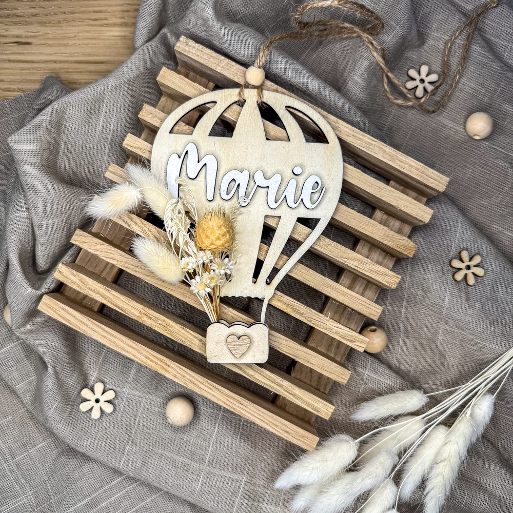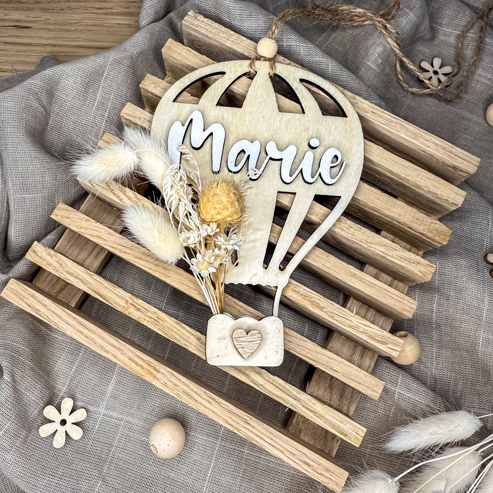 Mit viel Liebe gefertigt: Dieser süße Heißluftballon-Aufhänger aus naturbelassenem Holz wird ganz individuell mit dem Namen des kleinen Lieblings personalisiert. Ein handgebundenes Sträußchen aus zarten Trockenblumen macht ihn zu einem besonderen Hingucker.