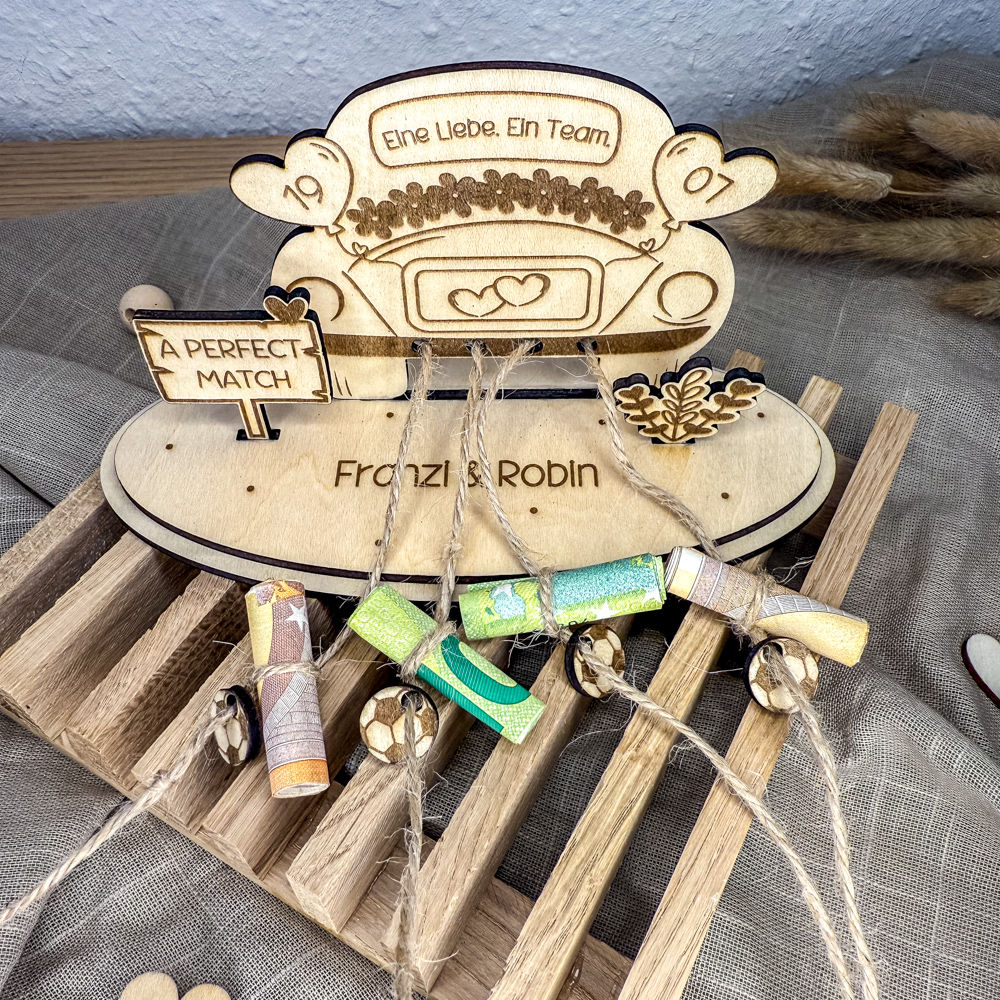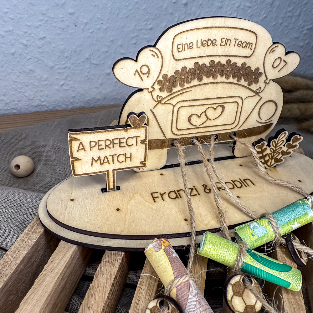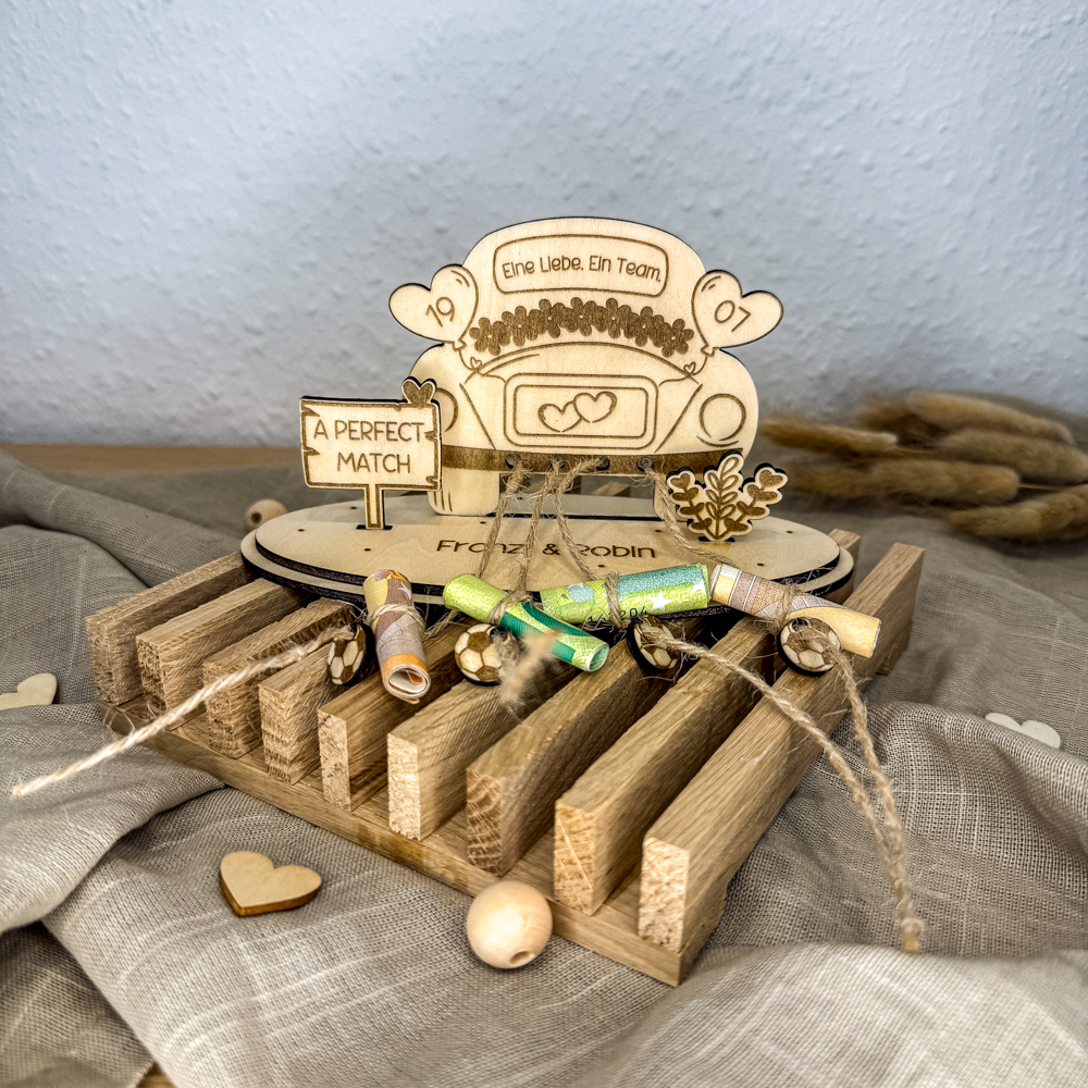 Ob als kreatives Geldgeschenk oder persönlicher Hochzeitsgruß – dieser Aufsteller vereint Liebe und Vereinsherz in einem einzigartigen Geschenk.