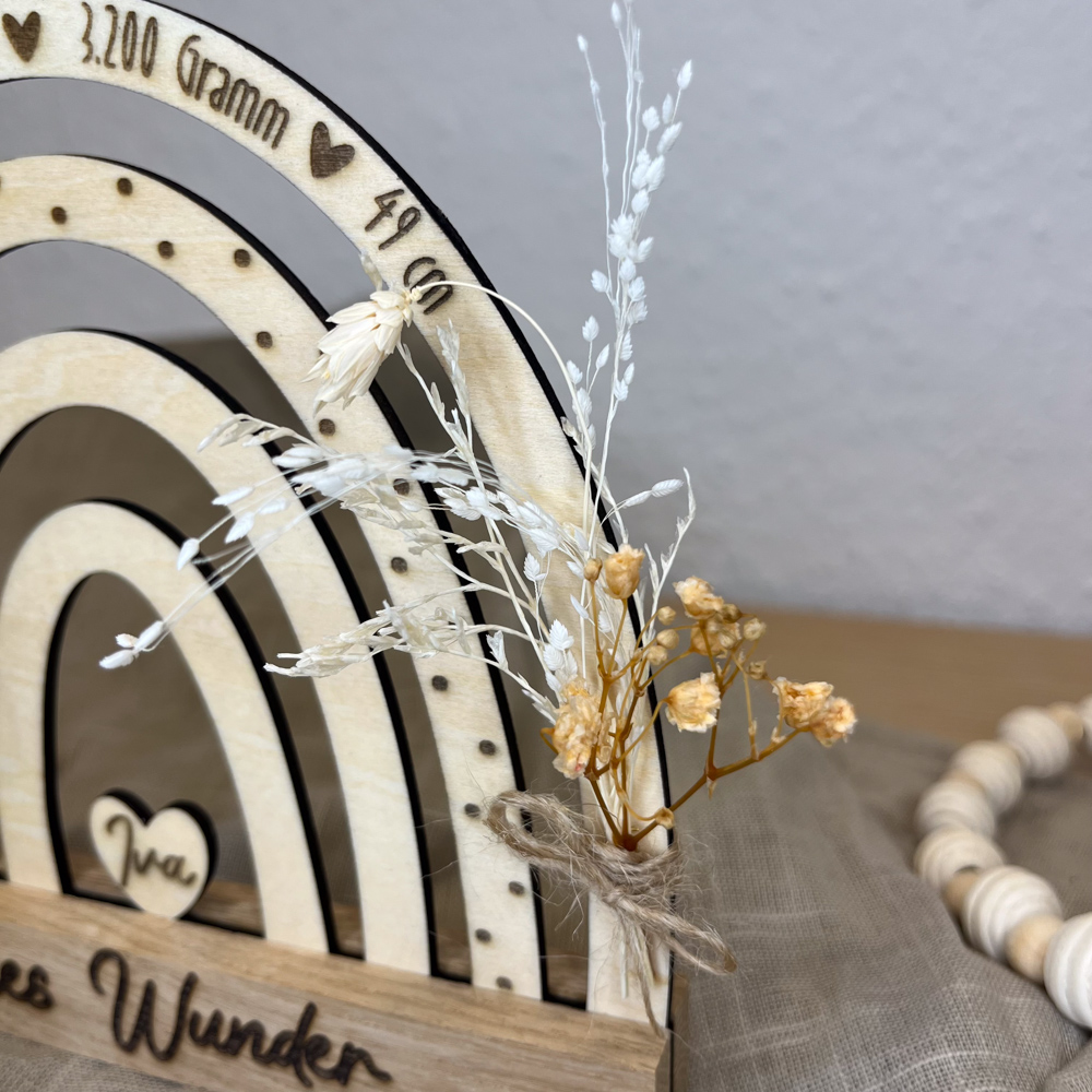 In der Mitte des Regenbogens findet sich ein kleines Herz, das wahlweise mit dem Namen des Babys personalisiert werden kann. Für sehr kurze Namen – etwa mit drei Buchstaben – bietet sich hier eine besonders stimmige Platzierung direkt im Herz an. Bei längeren Namen wird der Schriftzug hingegen elegant auf dem Holzsockel verewigt, während „Kleines Wunder“ auf einem hübschen Holztag seinen Platz findet, das liebevoll am Regenbogen befestigt wird.
