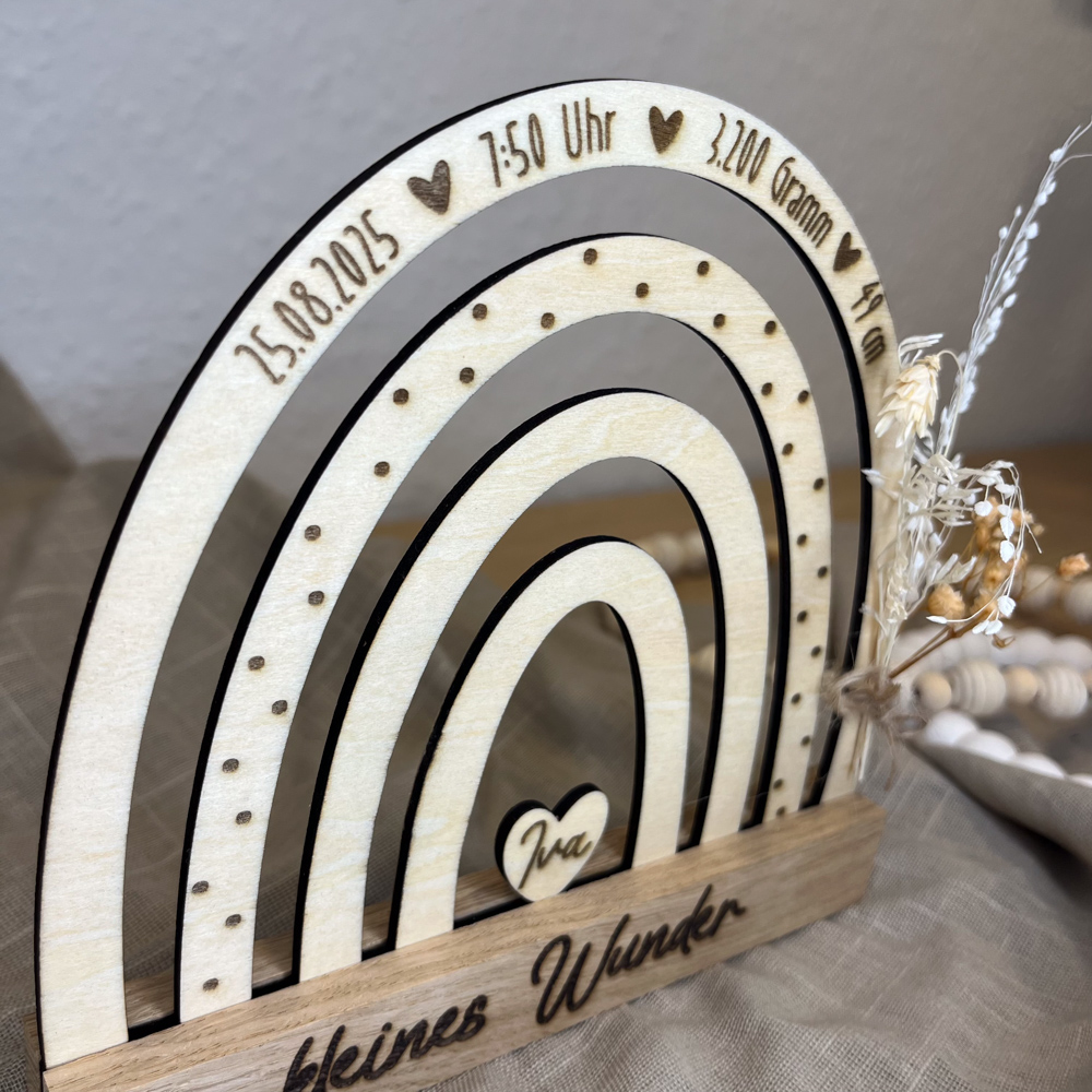Dieser zauberhafte Regenbogen-Aufsteller wird liebevoll aus Holz gefertigt und hält all die besonderen Daten fest, die den Beginn eines neuen Lebens unvergesslich machen – Geburtsdatum, Uhrzeit, Größe und Gewicht werden sorgfältig auf den obersten Bogen graviert und in einem harmonischen Design vereint.