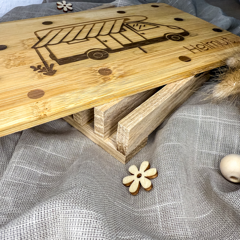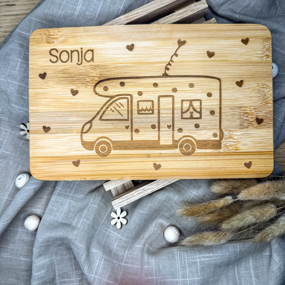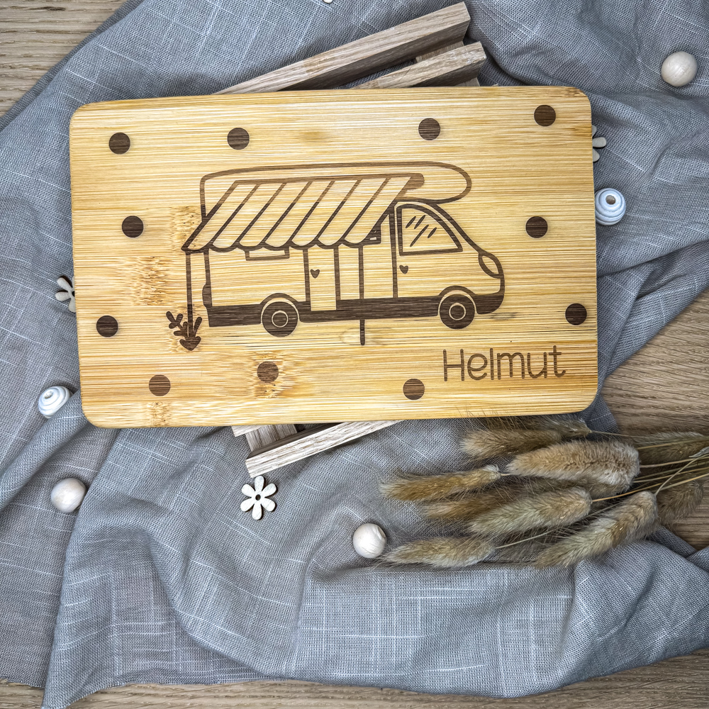 Das Bambusbrett mit Campervan-Motiv und deinem Wunschnamen ist ein ganz besonderes Stück. Jedes Brett wird sorgfältig von uns graviert und ist ein kleines Unikat mit persönlichem Charakter.