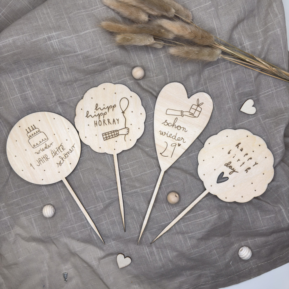 Ein Geburtstag ohne Kuchen ist möglich, aber sinnlos! Die liebevoll gestalteten Caketopper aus Holz setzen fröhliche Akzente auf jeder Geburtstagstorte und sorgen garantiert für Schmunzeln und Begeisterung.
