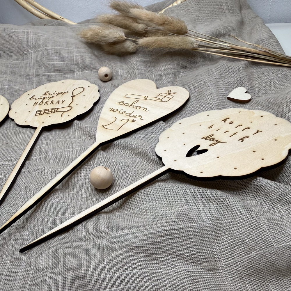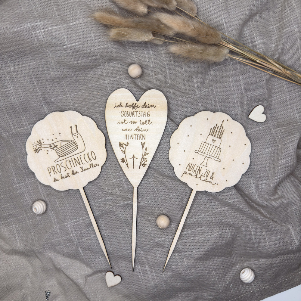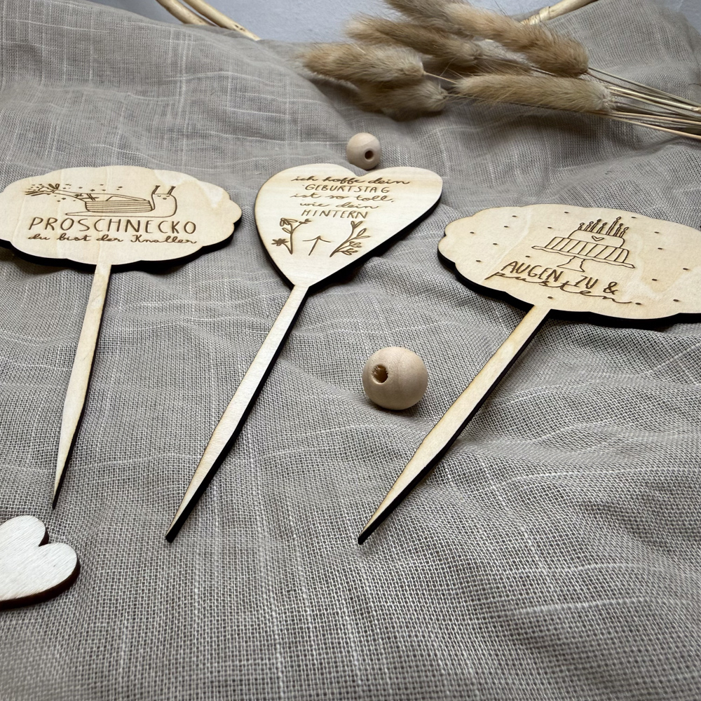 Ob mit witzigem Spruch, süßem Motiv oder einem Augenzwinkern – jeder Topper wird fein gelasert und überzeugt durch seine natürliche Optik und die klaren, detailreichen Gravuren. Die unterschiedlichen Formen und Designs machen sie zu kleinen Highlights, die perfekt auf den Geburtstagskuchen abgestimmt werden können.