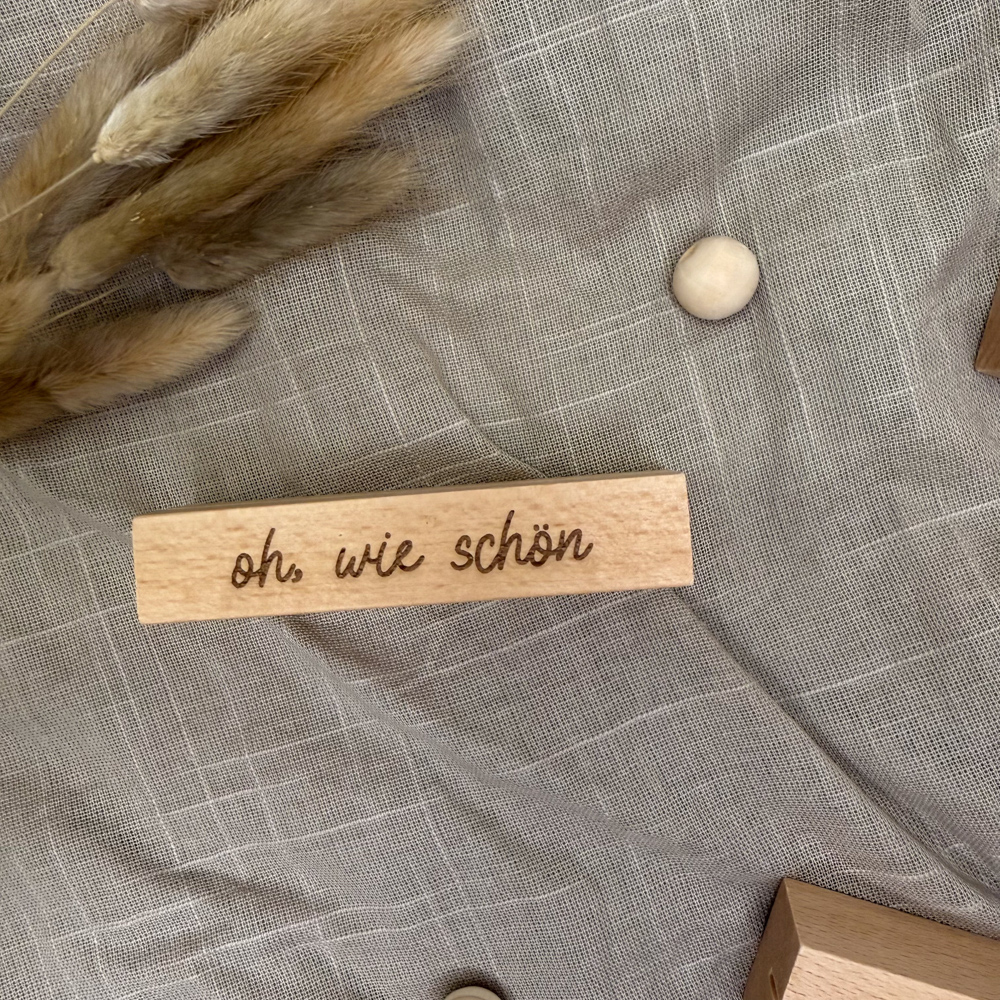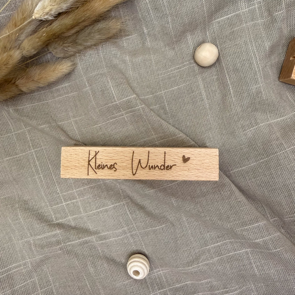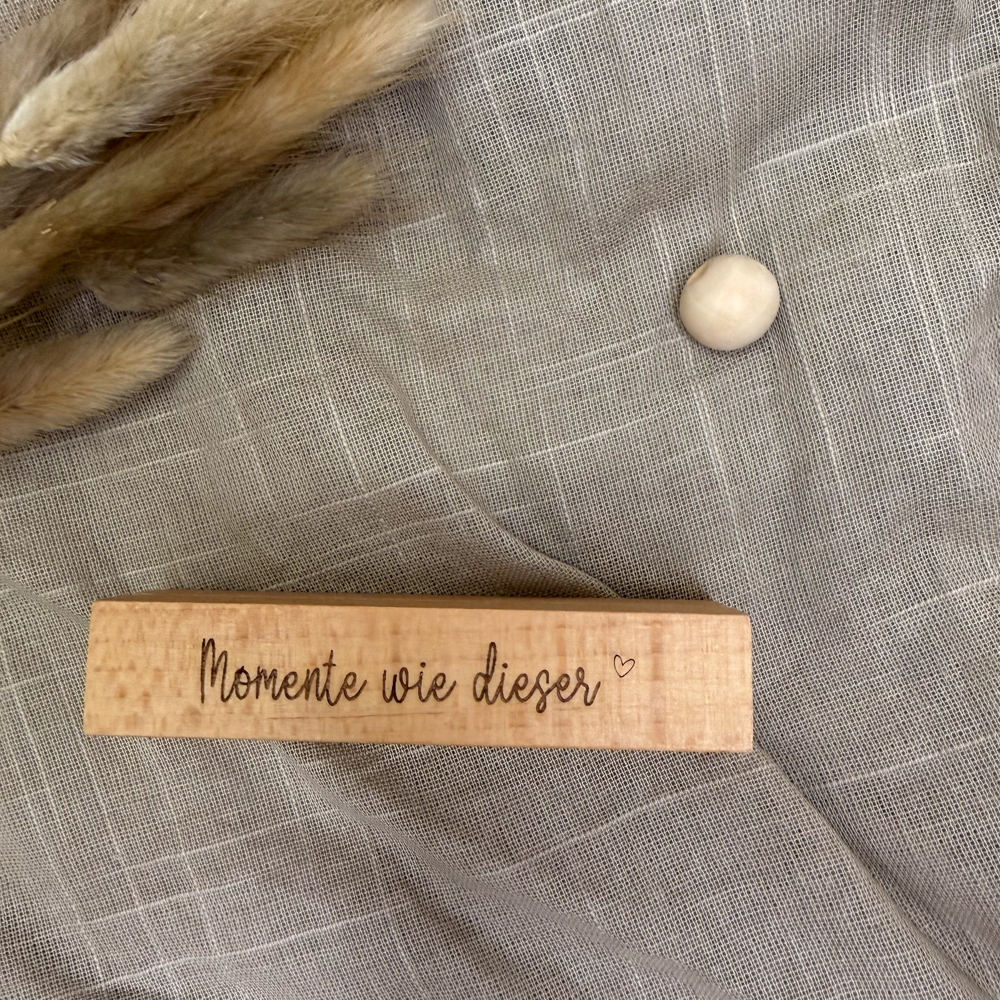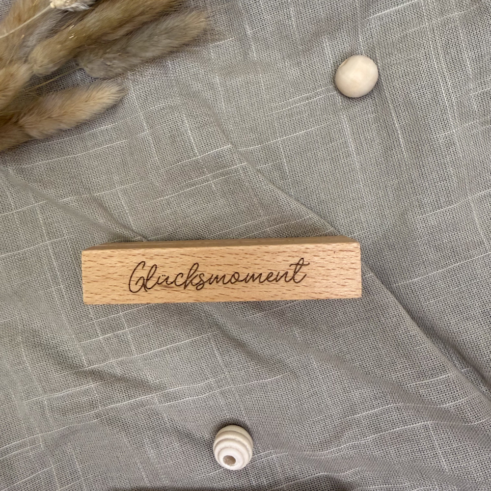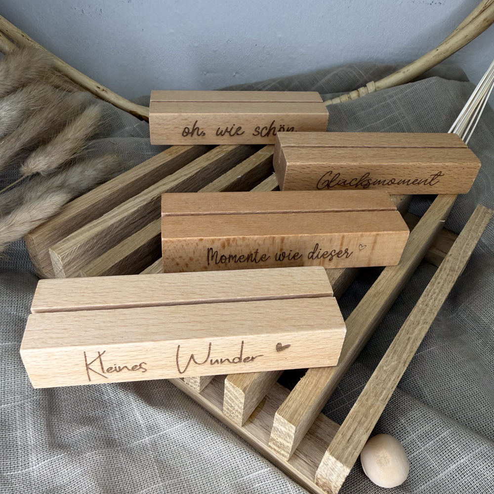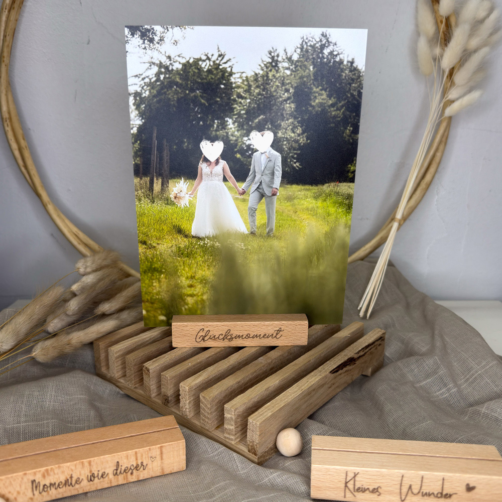 Der stabile Holzsockel bietet sicheren Halt für Fotos, Karten oder kleine Drucke und überzeugt durch seine klare Form und die schöne, natürliche Maserung des Holzes. Die feine Gravur eines liebevollen Schriftzuges rundet das Design ab und macht den Fotohalter zu einem persönlichen Blickfang – ganz gleich, ob auf dem Sideboard, im Regal oder auf dem Schreibtisch.