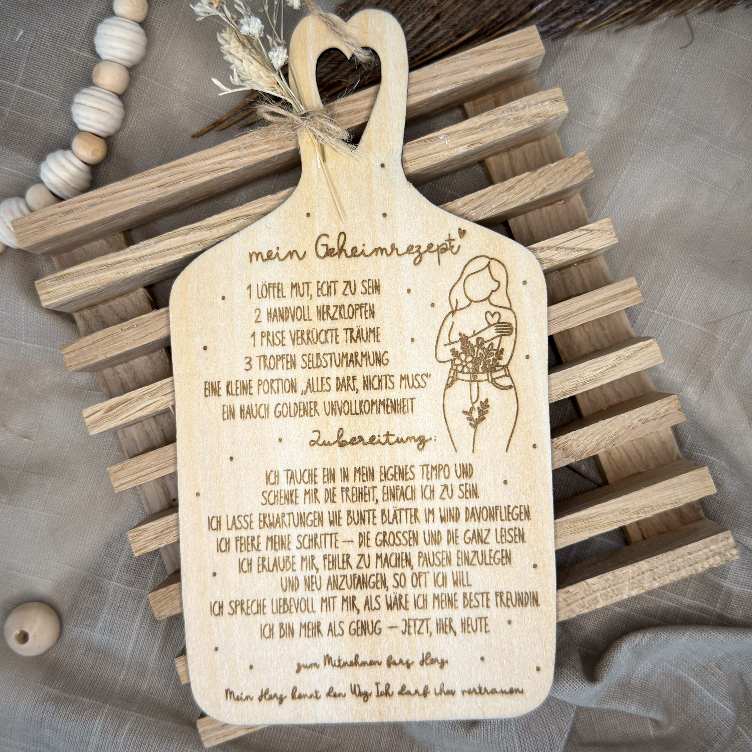 Dieses liebevoll gefertigte Holzbrett ist weit mehr als nur eine Deko – es ist eine kleine Erinnerung daran, wie wertvoll Selbstliebe, Mut und Leichtigkeit im Alltag sind. Mit seinem zarten Herzgriff, der feinen Lasergravur und dem poetischen Text ist das Brettchen ein berührendes Geschenk für Herzensmenschen, beste Freundinnen oder einfach für dich selbst.