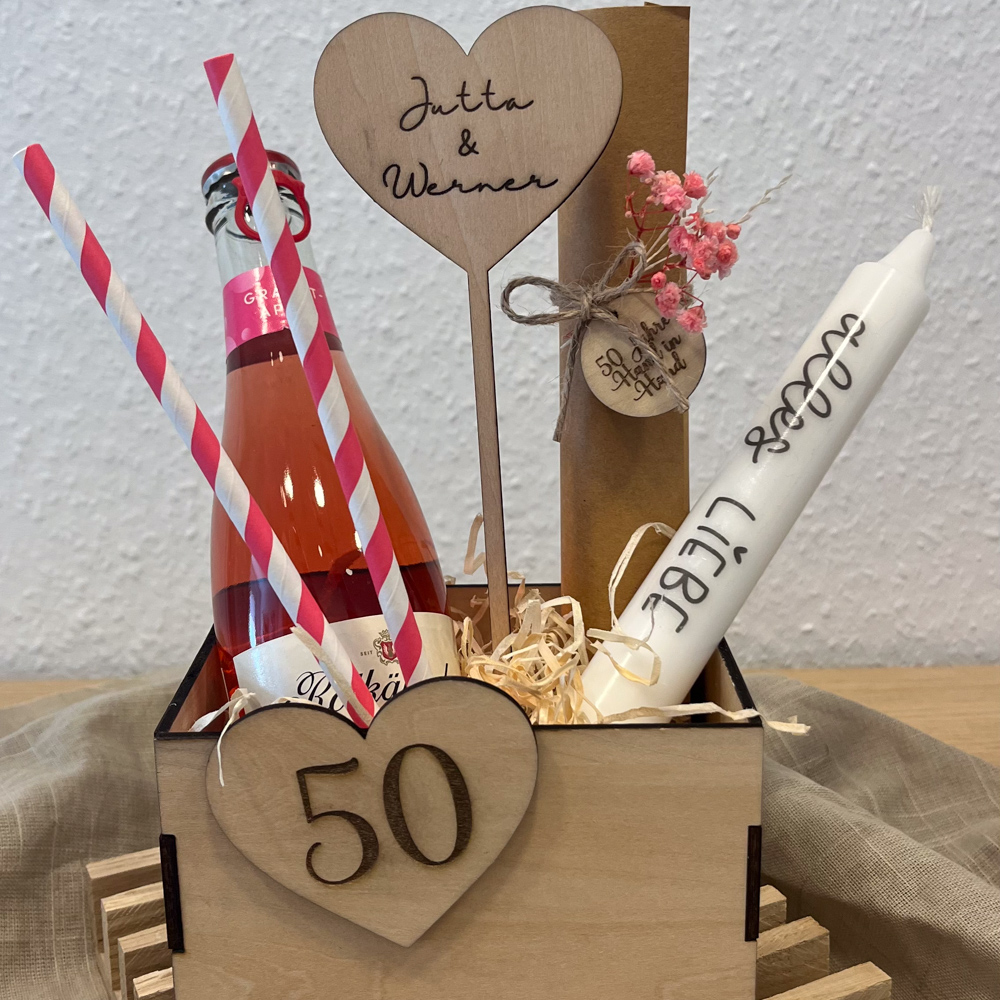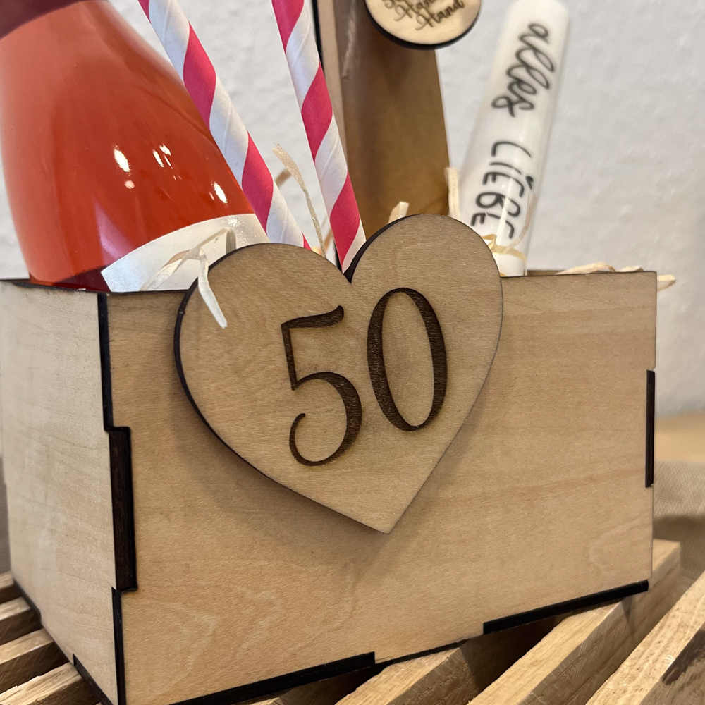 Eine zauberhafte Geschenkbox, die jedes Jubiläum oder jeden besonderen Anlass auf liebevolle Weise unterstreicht. Die hochwertige Holzbox wird mit einem Herz und der Wunschzahl – wie hier der 50 – veredelt und schafft so einen persönlichen und festlichen Blickfang.