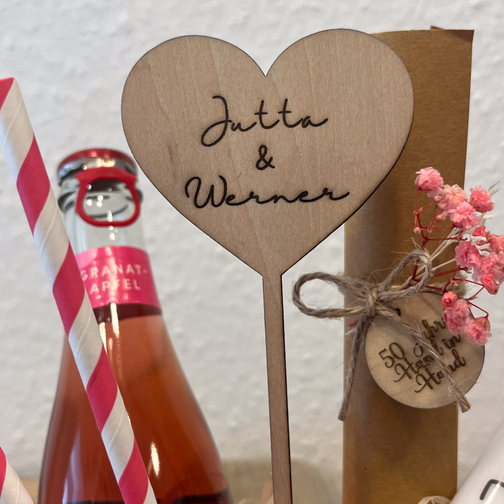 Im Inneren, gebettet auf Holzwolle, finden kleine Aufmerksamkeiten ihren Platz: Ein prickelndes Getränk, eine Kerze mit lieben Wünschen und zwei Papierstrohhalme. Natürlich kann alles individuell von dir ergänzt werden. Der dekorative Herzstecker mit personalisierbaren Namen rundet das Set harmonisch ab und macht es zu einem einzigartigen Präsent.