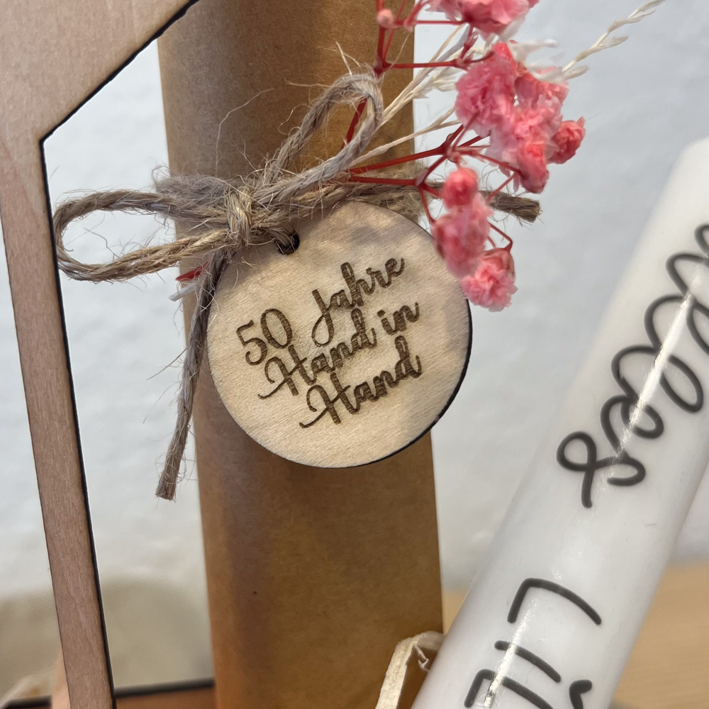 Bitte beachte: Die Box enthält keine Papierrolle, jedoch ist der daran befestigte, gravierte Anhänger mit dem Spruch „… Jahre Hand in Hand“ im Set enthalten. Er eignet sich wunderbar, um einen eigenen Gutschein oder eine Botschaft stilvoll in die Geschenkbox einzubinden.