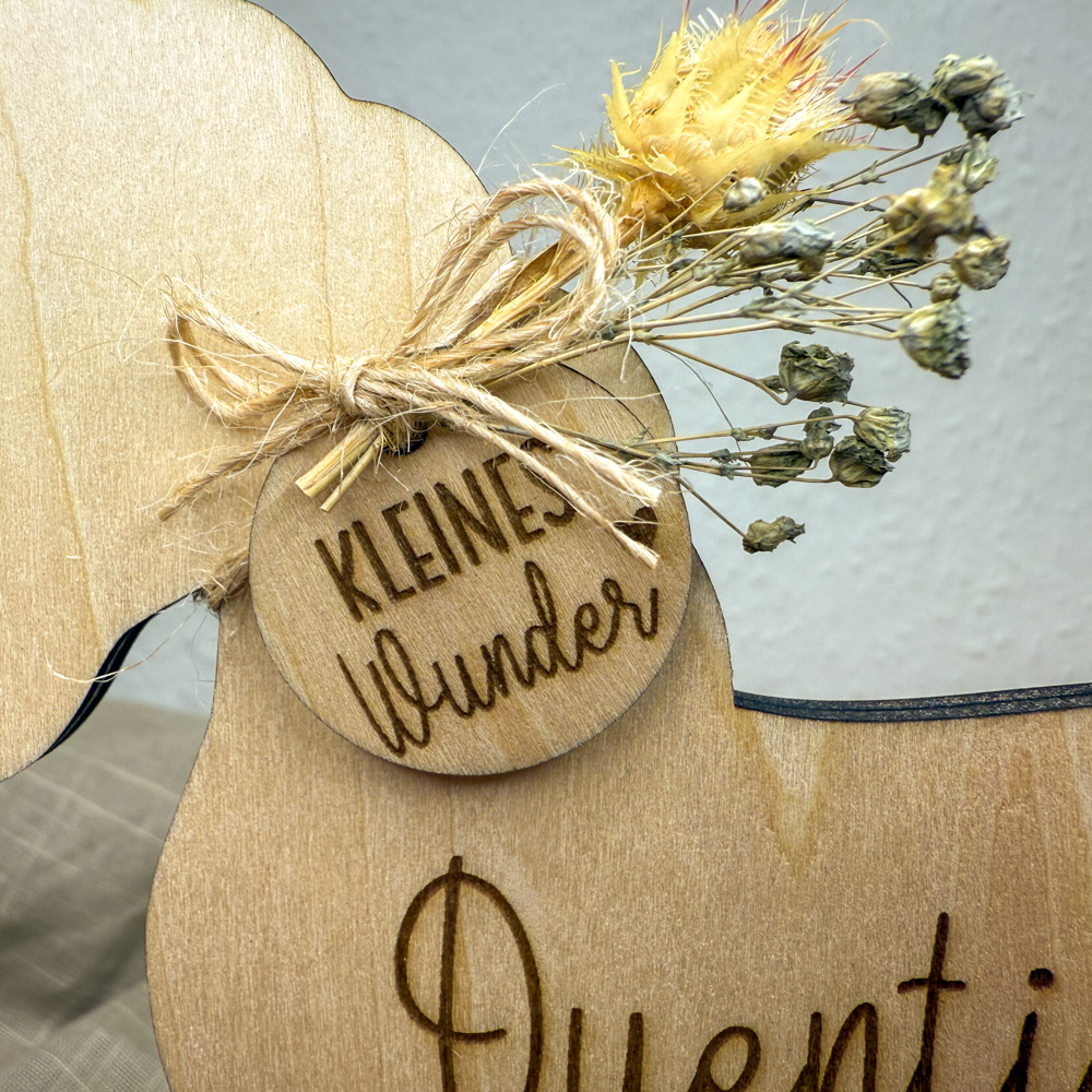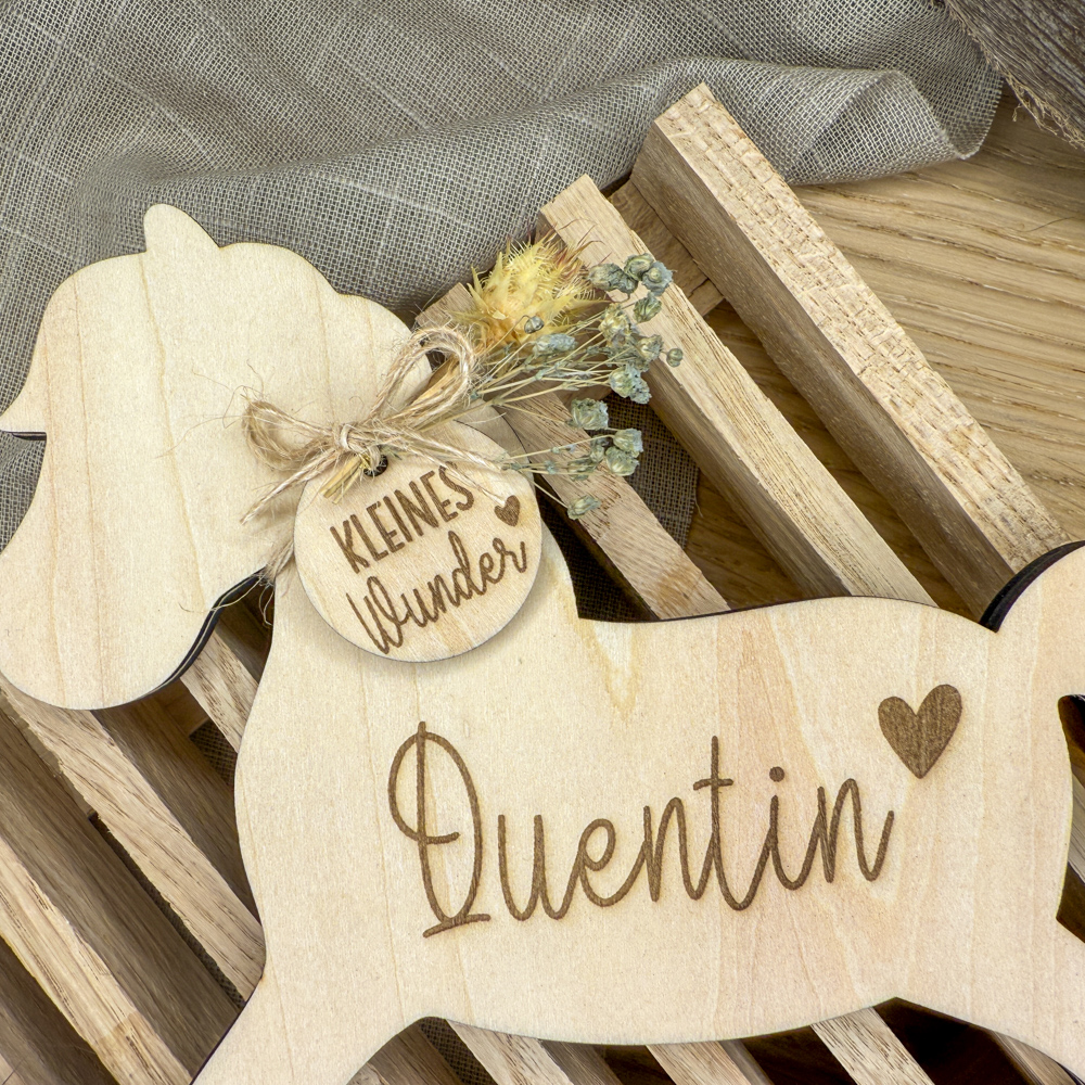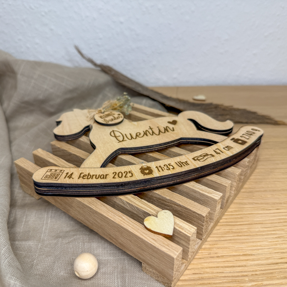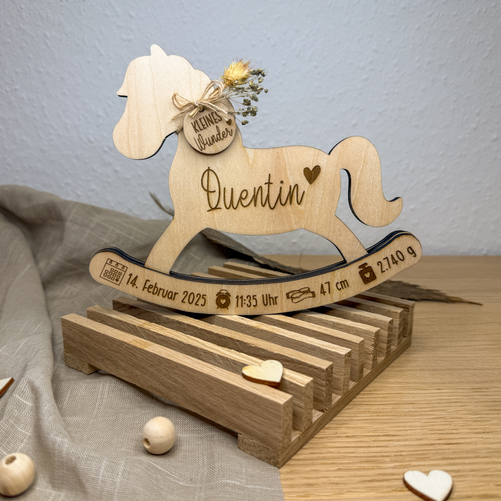 Dieses niedliche Schaukelpferd ist ein Muss für Pferdefans und auch für alle anderen frisch gebackenen Eltern ein absolutes Dekohighlight im Kinderzimmer. Geschmückt mit Trockenblumen und einem kreisförmigen Holzanhänger mit der Gravur „Kleines Wunder“ kommt das hölzerne Schaukelpferd personalisiert daher: Der Name des Babys steht auf dem Bauch des Pferdes, wobei Geburtsdatum, -uhrzeit, Gewicht und Größe auf den Kufen eingraviert sind.