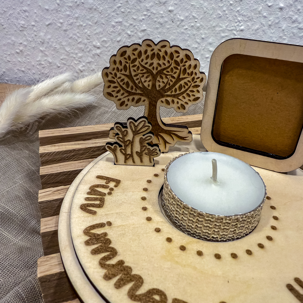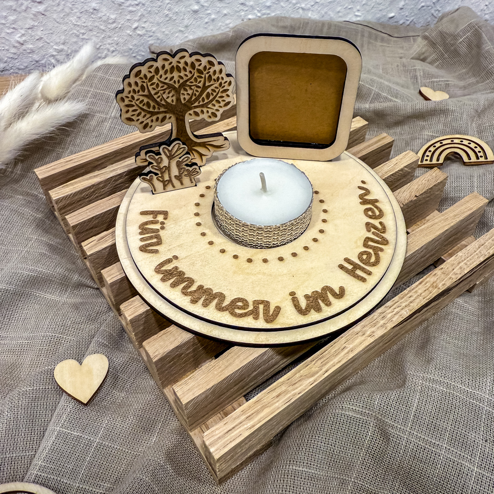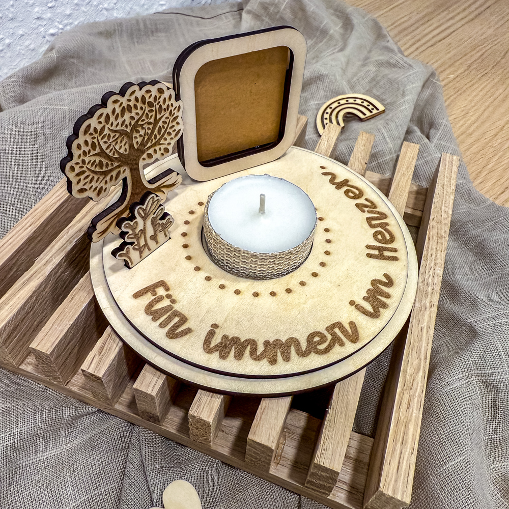 Der Aufsteller wird in Handarbeit aus hellem Holz gefertigt und enthält kleine Details wie einen filigranen Lebensbaum, eine Miniatur-Szene mit Blumen und ein Steckfach für ein Foto. Das sanfte Licht in der Mitte unterstreicht den stillen Moment und schenkt eine wohlige Wärme in Zeiten der Trauer.